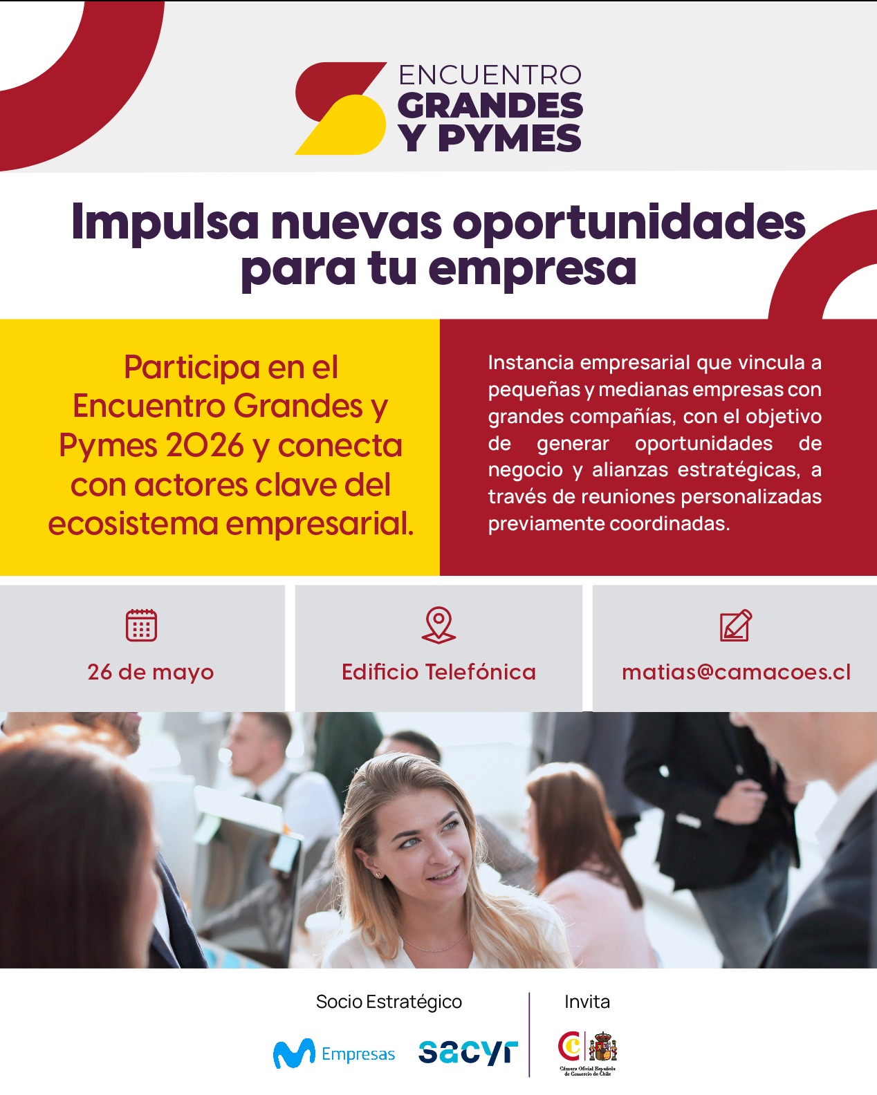 La Cámara Oficial Española de Comercio en Chile invita a las pymes y empresas medianas a sumarse a este encuentro y aprovechar una instancia única para conectar, presentar su negocio y generar nuevas oportunidades comerciales.